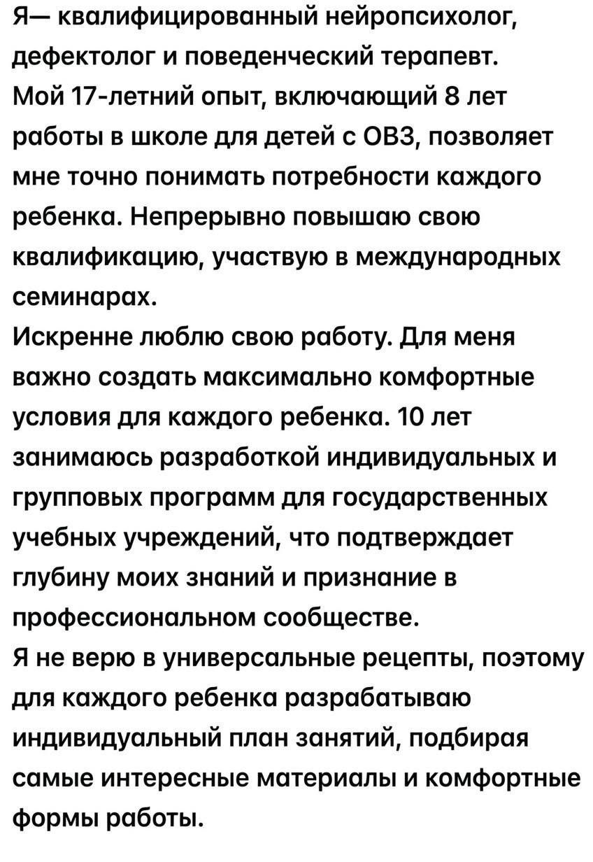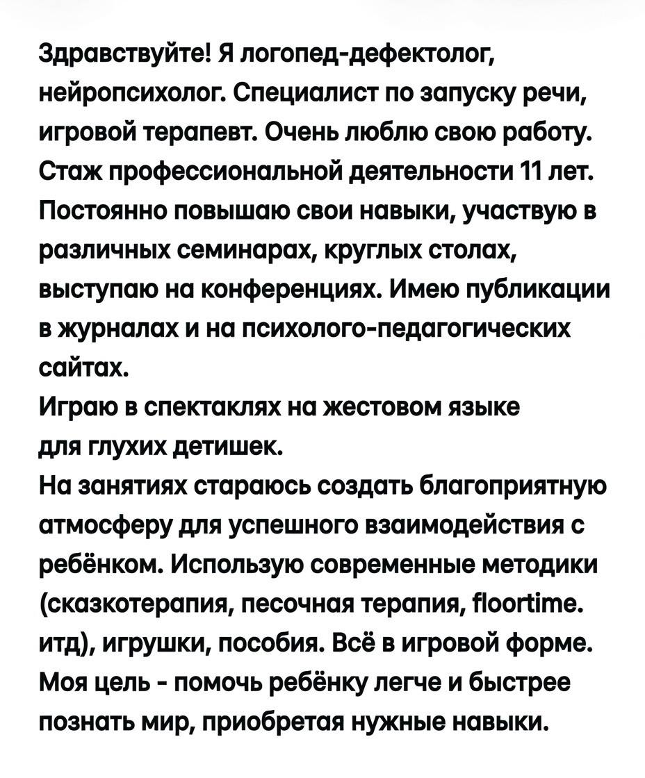 Алёна Валерьевна провела комплексную диагностику и предложила интенсивный курс, который включал не только работу над звуками, но и активную стимуляцию мозга (сенсорную интеграцию, работу над пониманием речи). Понравилось, что она работает через интерес, игру и активное взаимодействие.